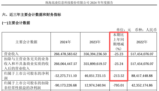 2024年,高凌信息的营业收入为2.66亿元,同比下降25.23%;归母净利润为-5236.57万元,同比下降213.52%。