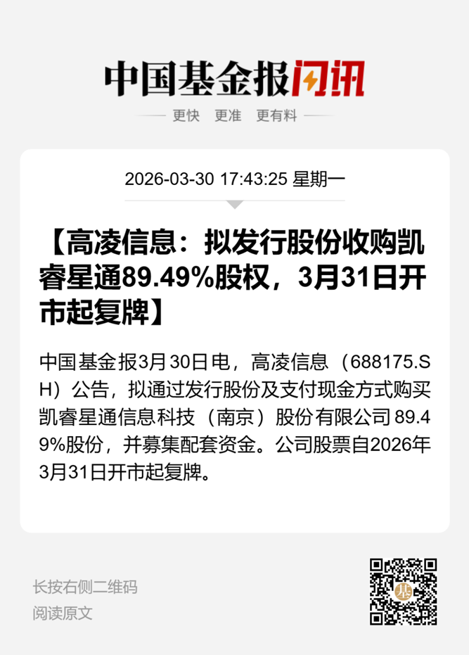 【导读】高凌信息拟收购凯睿星通89.49%股份,3月31日复牌后跌幅一度超10%