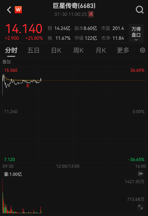 7月30日开盘,“周杰伦概念股”巨星传奇一度涨超30%。截至发稿,巨星传奇股价报14.14港元/股,涨幅达25.80%,总市值为122亿港元。