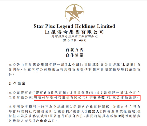 公告显示,近日,巨星传奇全资子公司星创艺(昆山)文娱有限公司(以下简称星创艺)与宇树科技签订合作协议书,双方将在全球范围内构建战略合作伙伴关系。