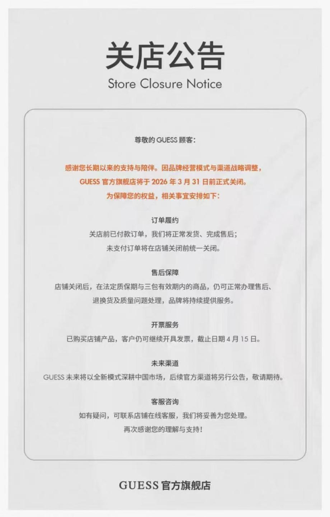 随后,GUESS官方旗舰店正式发布关店公告称,因品牌经营模式与渠道战略调整,GUESS官方旗舰店将于2026年3月31日前正式关闭。