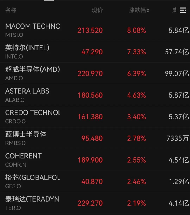 半导体板块反弹。英特尔大涨7.33%,超威半导体、ASTERA LABS、蓝博士半导体分别收涨6.39%、4.63%、2.78%。
