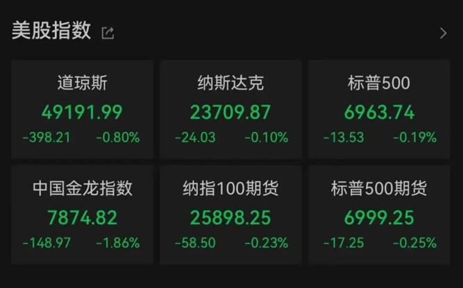 截至收盘,道琼斯工业指数下跌398.21点,跌幅为0.80%,报49191.99点;纳斯达克指数下跌24.03点,跌幅为0.10%,报23709.87点;标普500指数跌13.53点,跌幅为0.19%,报6963.74点。