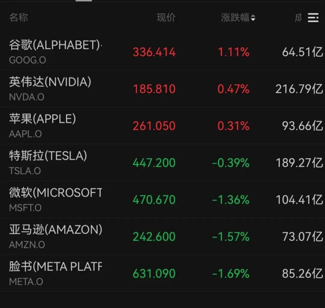 美股科技“七巨头”涨跌互现。谷歌-C、英伟达、苹果上涨1.11%、0.47%、0.31%,特斯拉、微软、亚马逊、脸书分别下跌0.39%、1.36%、1.57%、1.69%。