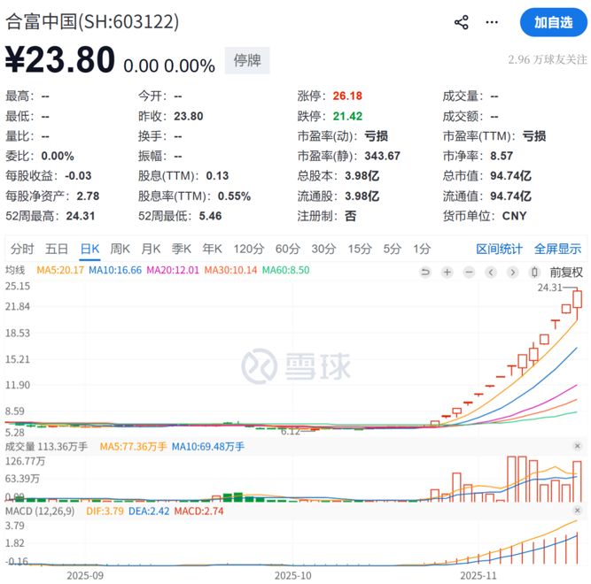 作为近期超级牛股,合富中国在10月28日至11月14日期间走出“14天12板”,累计涨幅高达256.29%,引发市场关注。停牌前,合富中国股价收于23.8元/股,总市值为95亿元。