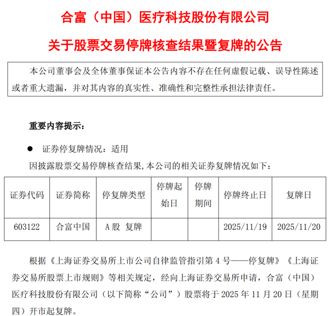 合富中国称,近期,公司就股票交易异常波动及严重异常波动的相关事项进行了核查。鉴于相关核查工作已完成,经向上海证券交易所申请,公司股票将于2025年11月20日(星期四)开市起复牌。