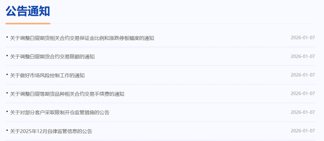 自2026年1月9日(星期五)收盘结算时起,交易保证金比例和涨跌停板幅度调整如下:白银期货AG2601、AG2602、AG2603、AG2604合约的涨跌停板幅度调整为16%,套保持仓交易保证金比例调整为17%,一般持仓交易保证金比例调整为18%。