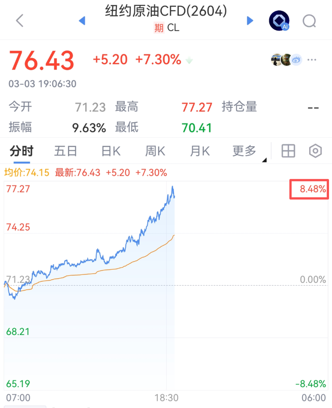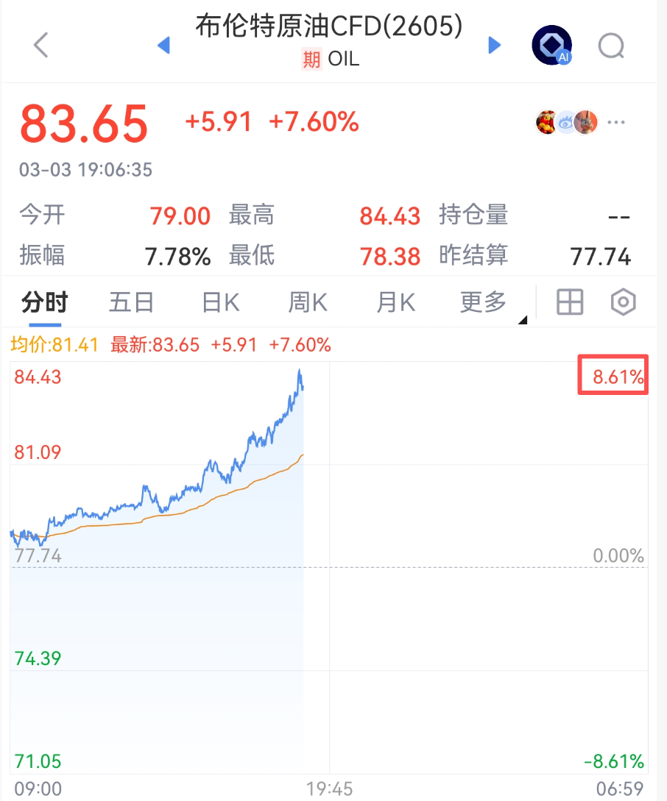 3月3日,国际原油价格持续走高,美油、布油盘中双双涨超8%。