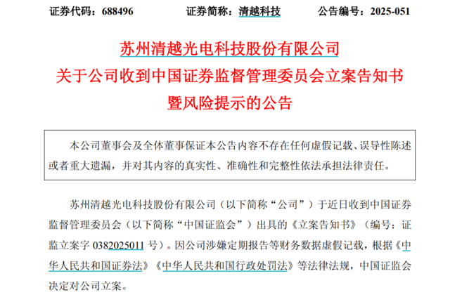 清越科技被证监会立案