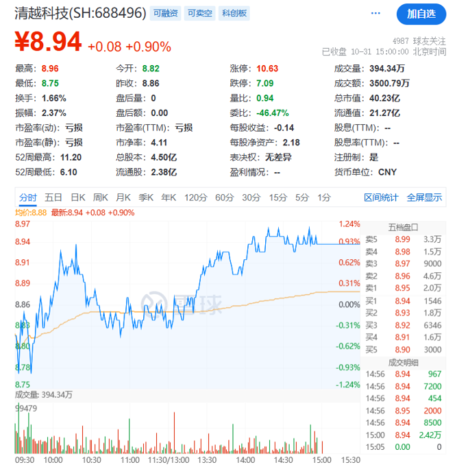 截至10月31日收盘,清越科技股价报8.94元/股,总市值为40亿元。