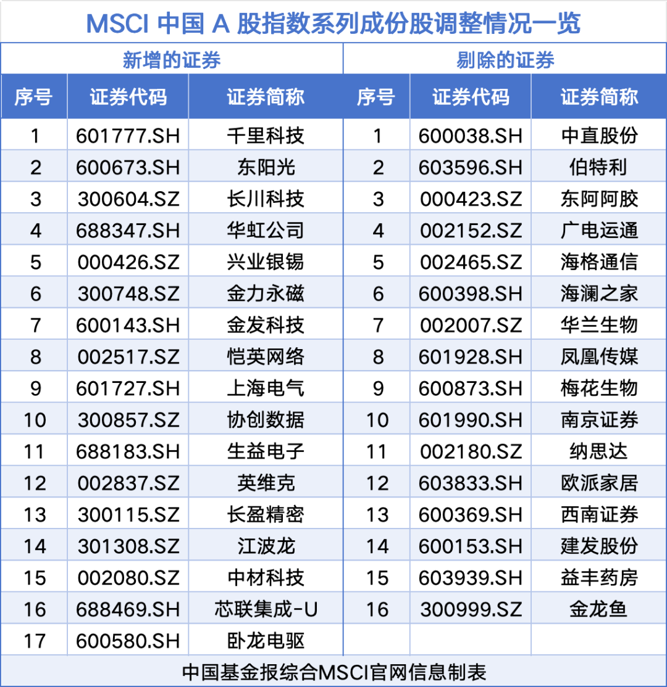 MSCI中国A股指数系列方面,将新增千里科技、东阳光、长川科技、华虹公司等17只证券,剔除东阿阿胶、海澜之家、南京证券等16只证券。
