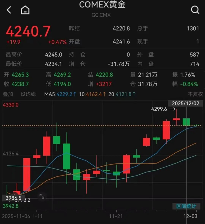 COMEX黄金期货日内曾跌至4200美元/盎司以下,跌幅超1%。美股交易时间段,COMEX黄金期货挽回部分跌幅,最终收跌0.84%。
