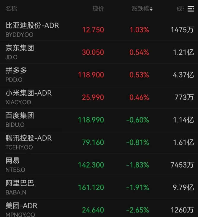 中国资产周二出现调整,科技股涨跌分化。比亚迪、京东、拼多多、小米分别上涨1.03%、0.54%、0.53%、0.46%,美团、阿里巴巴、网易分别下跌2.65%、1.91%、1.83%。
