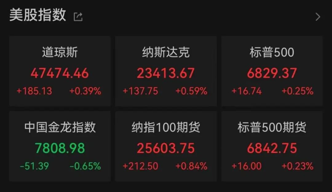截至收盘,标普500指数涨0.25%,报6829.37点;纳斯达克综合指数涨0.59%,报23413.67点;道琼斯工业平均指数涨0.39%,报47474.46点。