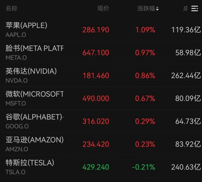 科技股普涨,英特尔涨超8%,领涨标普500成份股。科技“七巨头”的苹果、脸书、英伟达等分别上涨1.09%、0.97%、0.86%。