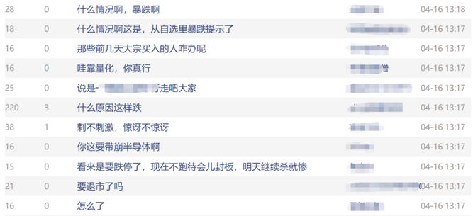 股民纷纷追问:“什么情况?”“什么原因这样跌?”也有股民表示“心态跌碎了”“这要带崩半导体”。