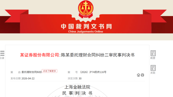 4月22日,上海金融法院就投资者陈某诉金融街证券托管纠纷案作出终审判决,明确这家券商需对陈某的投资损失承担10%的赔偿责任,赔付金额约71.21万元。