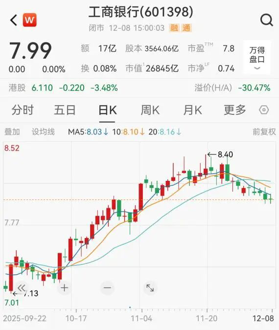 截至收盘,工商银行A股股价报7.99元/股,最新市值为26845亿元。