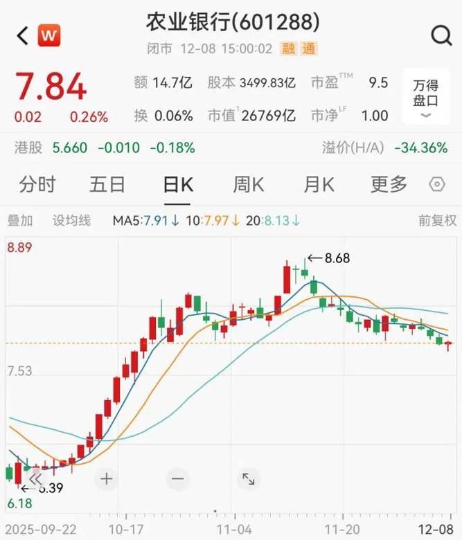 截至收盘,农业银行A股股价报7.84元/股,最新市值为26769亿元。