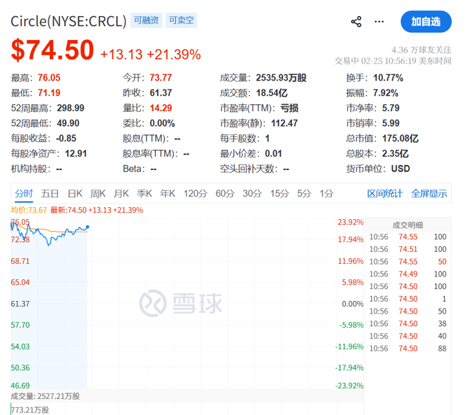 稳定币第一股Circle股价飙升超过20%。此前该公司表示,在其稳定币的强劲需求推动下,尽管第四季度数字资产市场处于低迷期,但公司的利润和营收依然实现了增长。