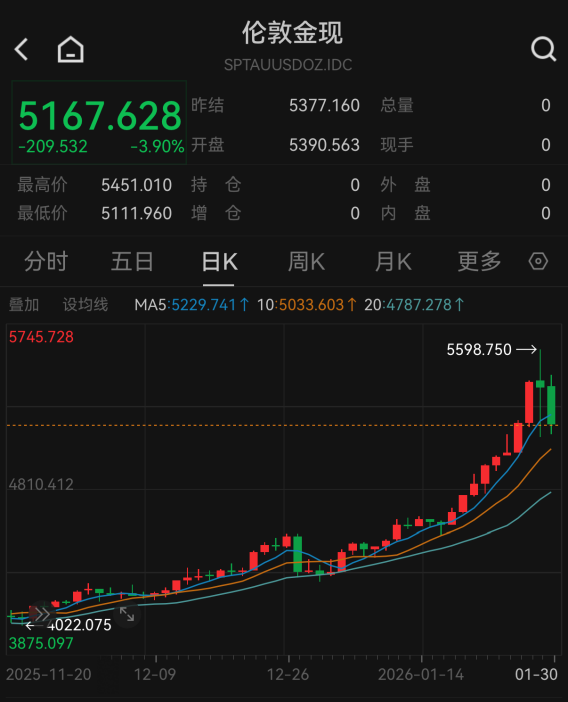 具体来看,金价在1月初重回4400美元/盎司后,一路突破多个关口。1月29日,黄金现货、期货双双站上5500美元/盎司,刷新历史新高。随后又从高位大幅回落。1月30日截至发稿,COMEX黄金报5188美元/盎司,伦敦金报5167.628美元/盎司,跌幅均超3%。