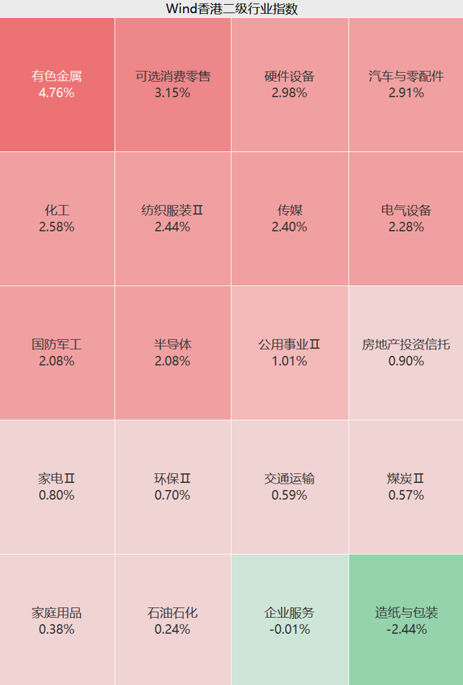 板块方面,上午港股有色金属、可选消费、硬件设备、汽车与零配件、半导体等板块集体走强,纸业、GEO等概念股下跌。