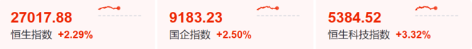 2月23日上午,港股市场高开高走,主要指数集体走高,恒生科技指数盘中一度涨超4%。截至午间收盘,恒生指数大涨604.53点,涨幅为2.29%;恒生科技指数涨3.32%,恒生国企指数涨2.5%。