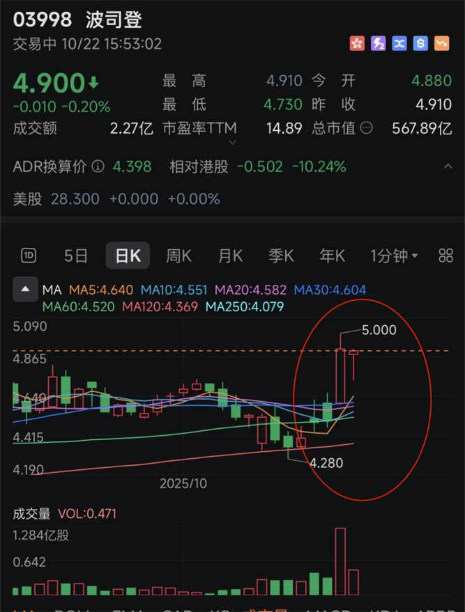 昨日(10月21日),波司登股价大涨近9%,报4.91港元,创下近期新高。