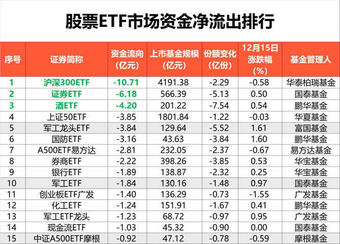 资金流出方面,昨日沪深300指数净流出居前,达12.21亿元,跟踪该指数的沪深300ETF昨日净流出10.71亿元,位居全市场首位。另外,上证50ETF、A500ETF易方达等产品,在宽基ETF中净流出居前。