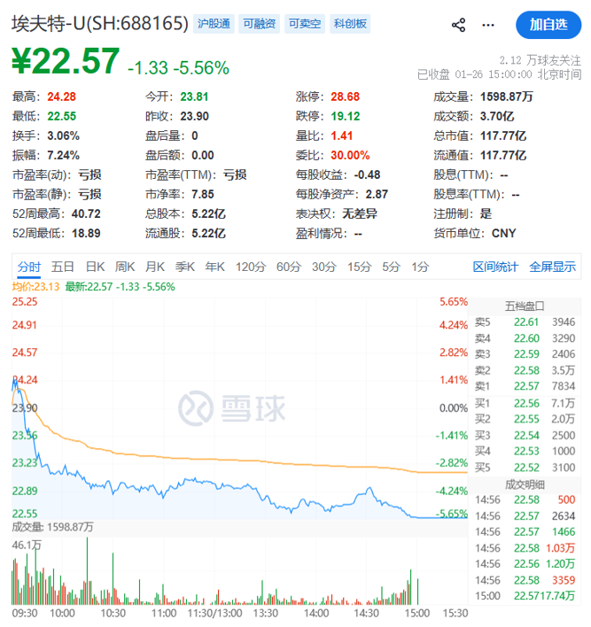 截至1月26日收盘,埃夫特股价报22.57元/股,总市值为117.77亿元。