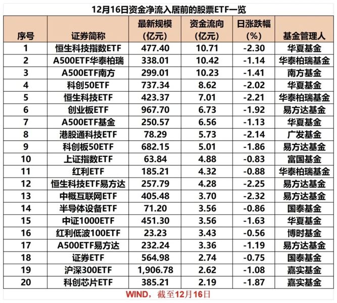 具体到指数维度,12月16日,中证A500指数相关ETF资金净流入居前,达35.85亿元。从5日角度观测,近期资金流入中证A500指数ETF超171亿元、恒生科技指数ETF超52亿元。
