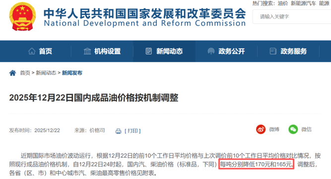 12月22日,国家发展改革委官网发布消息称,根据12月22日的前10个工作日平均价格与上次调价前10个工作日平均价格对比情况,按照现行成品油价格形成机制,自12月22日24时起,国内汽、柴油价格每吨分别降低170元、165元。