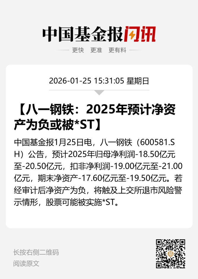 1月25日晚间,八一钢铁(证券代码:600581)公告称,预计2025年期末净资产为-19.50亿元至-17.60亿元。若经审计后的净资产为负,将触及上交所规定的退市风险警示情形,公司股票可能被实施退市风险警示(即股票简称前冠以“*ST”字样)。