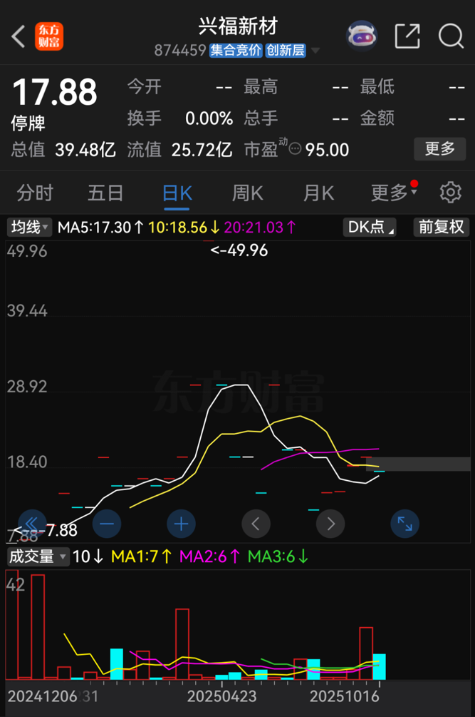 兴福新材是一家新三板挂牌公司。针对上述交易事项,兴福新材计划自1月21日起停牌。停牌前,兴福新材股价报17.88元/股,总市值为39.48亿元。