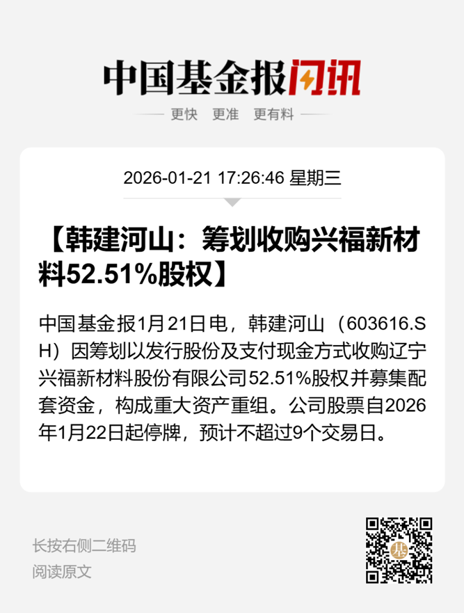 1月21日晚间,韩建河山发布公告称,公司正在筹划以发行股份及支付现金的方式,收购辽宁兴福新材料股份有限公司(以下简称兴福新材)52.51%的股份,并募集配套资金,预计构成重大资产重组。