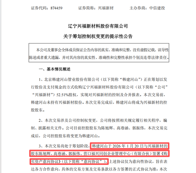 兴福新材、韩建河山均公告称,1月20日,韩建河山与本次交易的主要交易对方陈旭辉、高巷涵、郭振伟,以及营口福兴同创企业管理中心(有限合伙)(以下简称福兴同创)签署《购买资产意向协议》。