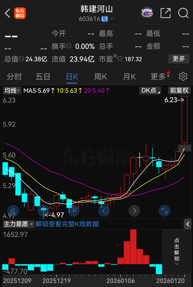 1月20日收盘,韩建河山股价报6.23元/股,涨幅达10.07%,总市值为24.38亿元。