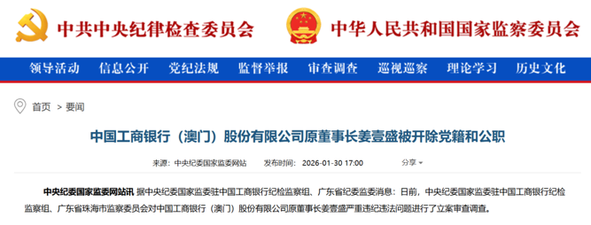 1月30日,中央纪委国家监委官网通报:中国工商银行(澳门)股份有限公司原董事长姜壹盛被开除党籍和公职。