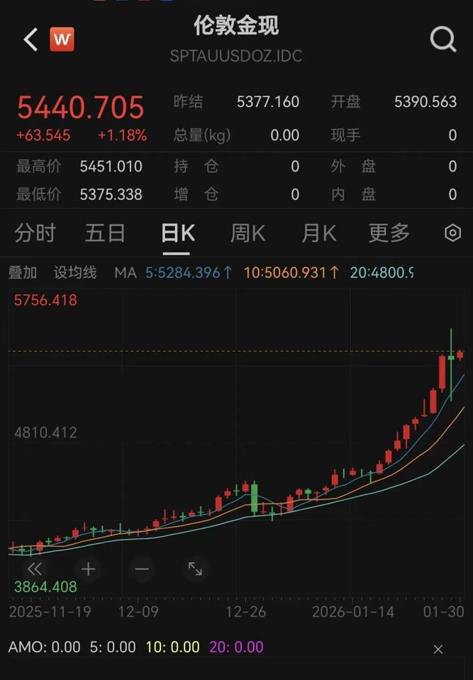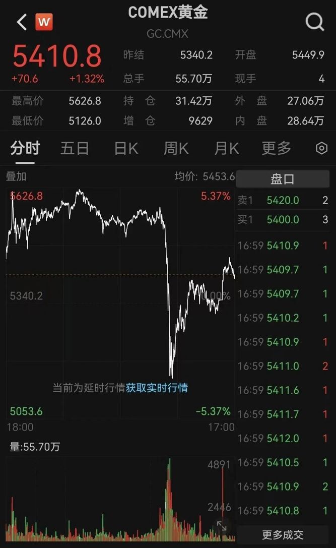 昨夜国际贵金属价格上演史诗级巨震。金价在突破5500美元/盎司后快速冲高,触及5626.8美元/盎司的历史新高,随即大幅回落,一度暴跌。但随后迅速止跌回升,现货黄金单日振幅接近500美元,