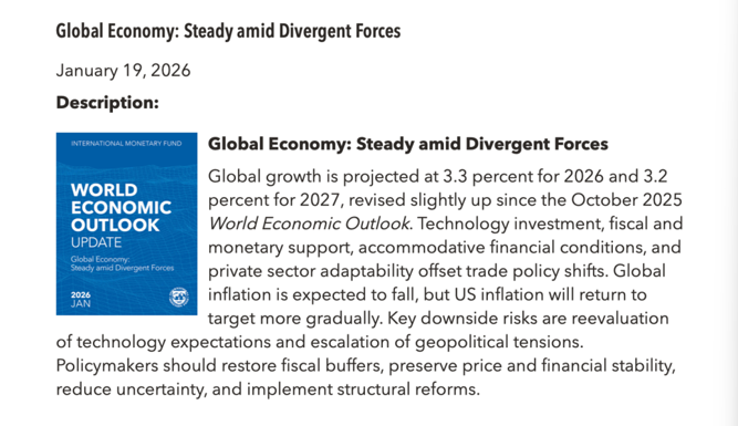 1月19日,国际货币基金组织(IMF))发布的《世界经济展望报告》更新了内容,相较于10月预测,IMF将2025年中国经济增长率上调0.2个百分点至5%;同时,将2026年增速预测值上调。