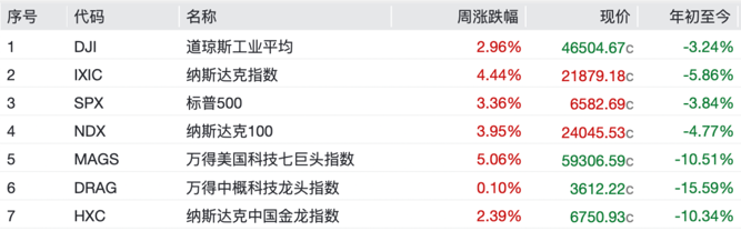 从本周整体表现看,道指累计上涨2.96%,标普500指数涨3.36%,纳斯达克综合指数大涨4.44%,三大指数均录得周线涨幅。