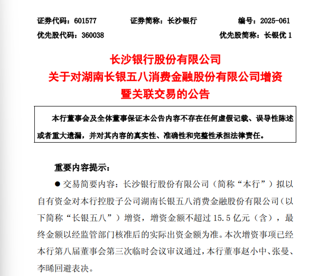 长沙银行公告显示,拟以自有资金对长银五八消金增资不超过15.5亿元(含),最终金额以监管部门核准为准,本次增资旨在提升该消金的资本实力和风险抵御能力,推动其可持续发展。