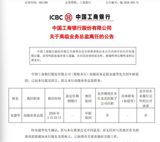 2月25日,工商银行发布公告称,该行高级业务总监宋建华因年龄原因,已经向该行提交辞呈,并辞去该行高级业务总监职务,离任时间为2026年2月25日。