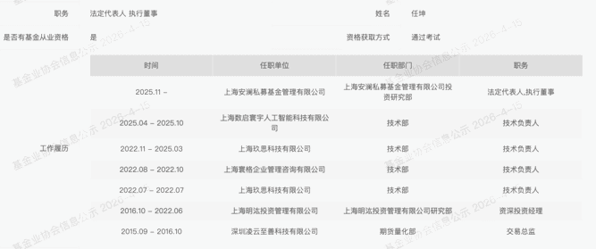 值得注意的是,安澜私募的法定代表人、执行董事任坤的从业履历横跨顶级量化与科技领域。任坤曾于2016年10月至2022年6月就职于明汯投资研究部,担任资深投资经理。
