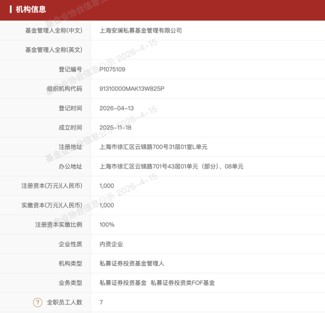 公开资料显示,安澜私募成立于2025年11月,注册资本为1000万元,机构类型为私募证券投资基金管理人,共有7名全职员工。