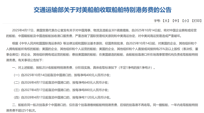 根据《中华人民共和国国际海运条例》等法律法规和国际法基本原则,经国务院批准,自2025年10月14日起,对美国的企业、其他组织和个人拥有船舶所有权的船舶;美国的企业、其他组织和个人运营的船舶;美国的企业、其他组织和个人直接或间接持有25%及以上股权(表决权、董事会席位)的企业、其他组织拥有或运营的船舶;悬挂美国旗的船舶;在美国建造的船舶,由船舶挂靠港口所在地海事管理机构负责收取船舶特别港务费。有关事项公告如下: