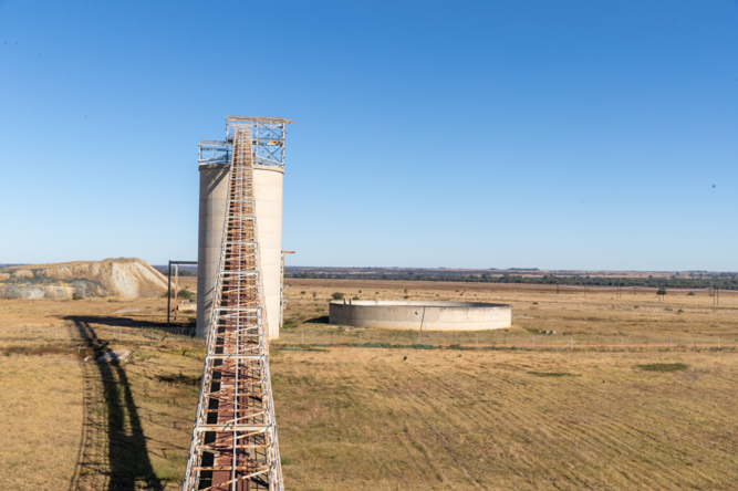 在坑口,工程师修建了一座巨大的水泥斜坡,矿车将矿石运到坑口后,继续沿着斜坡向上,把矿石运送到数十米高的斜坡顶端,再投送到下方的料斗中,矿石从料斗下落至下方的传送带,再由传送带进一步抬升,运送到更高的圆柱形高塔中,后者是一座巨大的矿石存储罐。