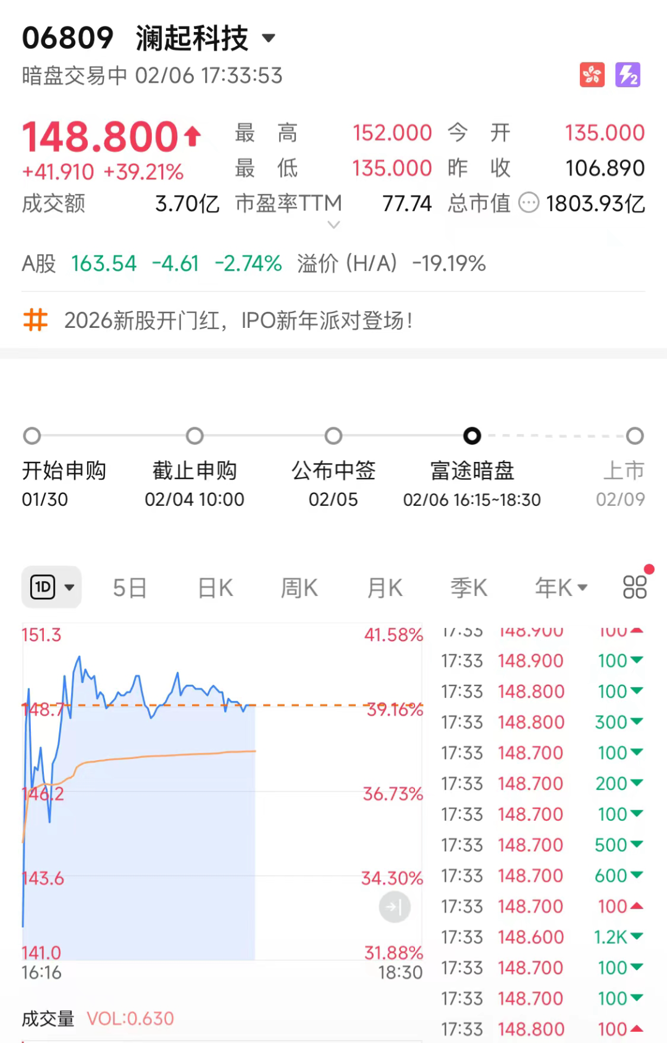 2月6日,澜起科技港股开启暗盘交易。截至发稿,澜起科技富途暗盘上涨39.21%,报148.9港元/股。