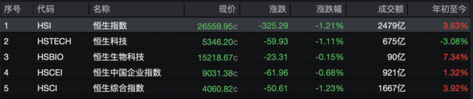 2月6日,港股三大指数集体下跌。其中,恒生指数跌1.21%,报26559.95点;恒生科技指数跌1.11%,报5346.20点;恒生国企指数跌0.68%,报9031.38点。全日大市成交额为2479亿港元,南向资金净买入148.59亿港元。本周,南向资金累计净买入560.69亿港元,恒生指数累计下跌3.02%。