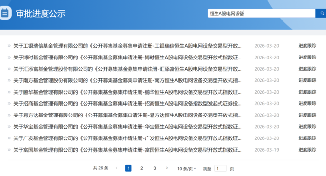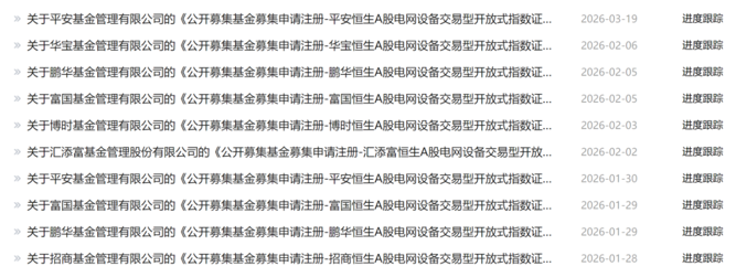 近日,中国证监会官网最新公示信息显示,易方达、广发、富国、南方、博时、汇添富、工银瑞信、招商、鹏华、华宝、平安等超10家国内头部及实力派公募基金,于3月19日至20日集中提交产品募集申请注册材料,申报品种均为跟踪恒生A股电网设备指数的指数产品,类型包括ETF、ETF联接基金或普通指数型基金,扎堆布局态势十分明显。